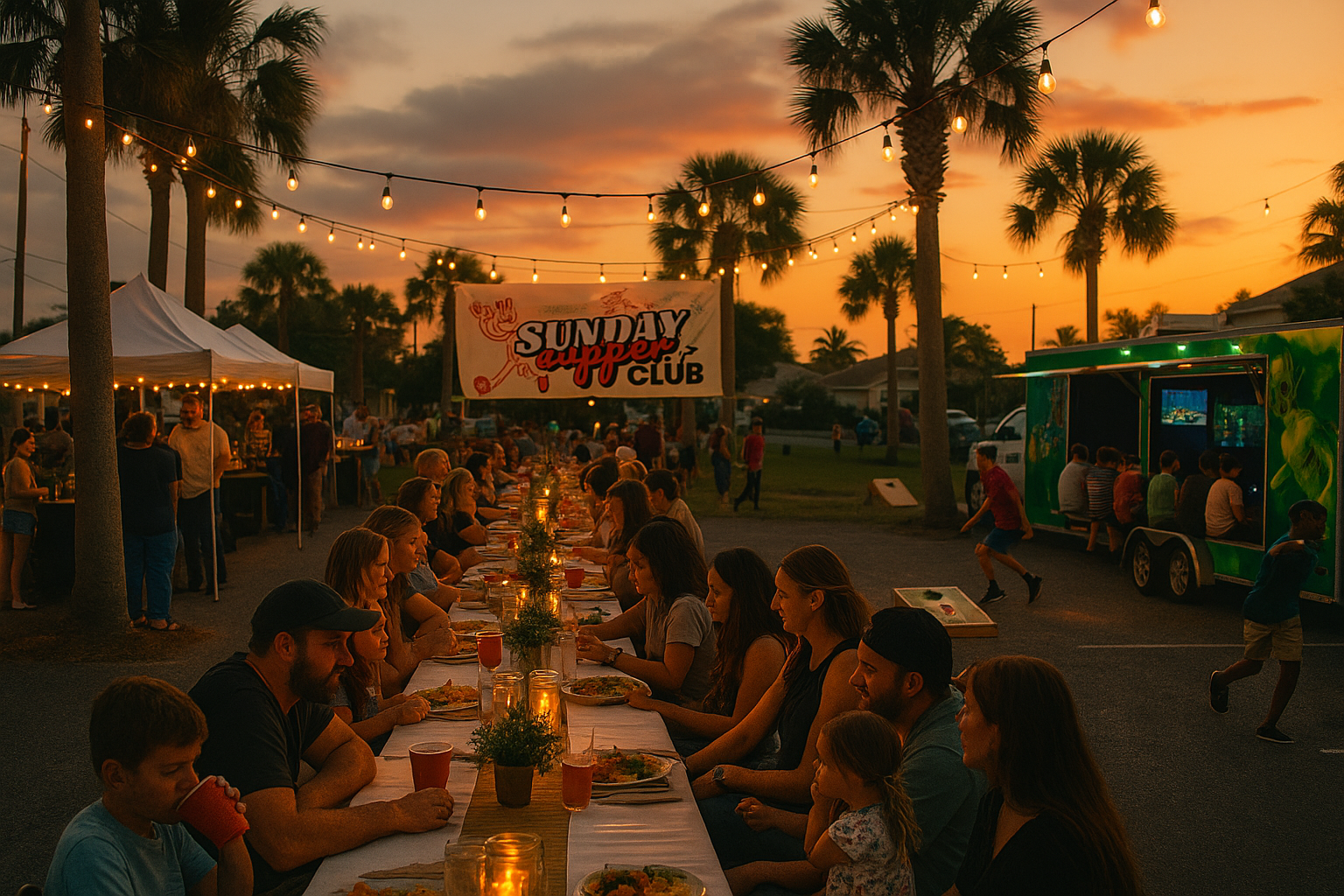 Sunday Supper Club is a pop-up neighborhood experience featuring good food, games, music, and local flavor — designed for families, friends, and neighbors to connect without leaving their own community. Each event feels like a backyard party meets block festival — easy, walkable, and full of personality. Our goal is to create a walkable event, right in your Brevard Neighborhood so you don’t have to travel to other communities or cities on the Space Coast. Interested in the SSC coming to your community? Email us at info@blkwatermedia.com